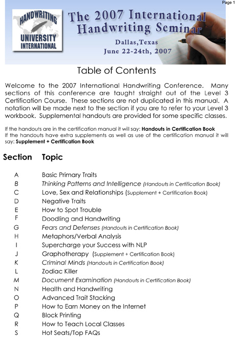 Imagine getting a front row seat at Handwriting University's Annual Handwriting Conference entirely on your MP3 player. Now, you can download All 16 sections (Almost 16 hours of content...just a click and download away. These mp3 files will play on all PCs, Macs, iPods or any MP3 player. Or, just listen and learn on your computer. You can even burn your own CDs of all lectures of the six guest speakers. Plus, every page of each speaker's lecture is available in PDF format so can follow along... just like you were in the front row. No section has been left out... all handouts are included. The average attendee spent over $1000 on seminar tickets, hotel, travel, and food. In fact, similar audio courses sell on our website for over $599 everyday. Now, this "never before published" private recording and PDF manual can be yours for this one time offer price of just $97. This product is not on our catalog page and may never be offered again. You get instant access within 10 minutes of checkout through a special password protected download page.