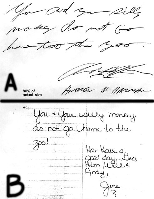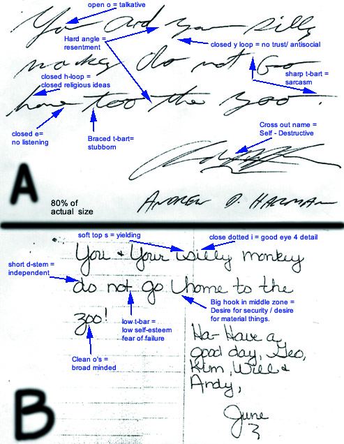 Bart's Analysis: A: Andrew and June are two very different people. You can tell by the difference in slant, pen pressure, and speed of the writing that they think and behave different than each other. Now, from a compatibility standpoint, too many differences in basic personality are RED FLAGS for a long and loving relationship. However, some couples find that "opposites" attract. If these two were dating, this would be the case. June might find Andy's impulsive, gregarious, sarcastic, and obnoxious behavoir entertaining becaues she is unable to be that outgoing and funny. And, Andy would find June compliant and non-aggressive personality style a breath of fresh air because he would have to combat her at every turn. You see, Andy is basically a bully with lots of ENERGY, resentment, anger, stubborness, and confidence. Therefore, he might respect a strong women much more than June... but he might like the fact she won't punch his lights out every time he makes rude comment. Now, June has her own issues to deal with. Her low self-esteem is the main issue that holds her back. You will notice the very low crossed t-bar in the word "not." This indicates a fear of a failure and a tendency to stay in bad or mediocre situations too long. Also, her signature isn't near as large as Andy's ... indicating her EGO isn't as large as his. So, he will take over in conversation. June would attempt to CONTROL the relationship by withdrawing her affection and setting up strict RULES to follow. I know this because anyone with a very rigid baseline is a bit anal retentive. These perfectionist basically have a global fear of things going wrong, being out of place, or not being in control of her world. Since Andy is basically uncontrollable (in a fun way.), he will drive her nuts wiht his constant un predictable behavoir. June is a honest lady who can be both kind and generous. She is just a bit too timid for a fire-cracker like Andy. She also doesn't have the strong internal self-esteem to handle someone with unresolved ANGER issues, excessive stubborness, or ego-maniacal behavoir. So, in my opinion, whatever initial attraction would soon turn into a real mind-game where June would be the loser. Now, would she have the confidence to leave? Probably not. Will she be happy? Probably not. But Hey? Not everyone has relationships to be happy, have fun, and learn. I know that's my purpose.. but judging by the number of totally disfunctional, violent, screwed up relationships we hear about... some people obviously need to fight. Hmmm. Makes you wonder. What's your opinion? BART BAGGETT |